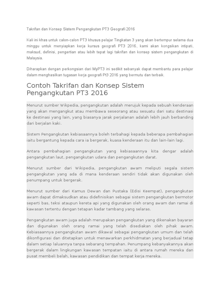 Semoga perkongsian bahan-bahan rujukan panduan bahan pembelajaran dan pengajaran contoh-contoh karangan sumber rujukan PT3 Pentaksiran Tingkatan 3 tingkatan 1 tingkatan 2 tingkatan 3 dalam post di blog Bumi. Transport merujuk kepada kenderaan yang membawa seseorang atau sesuatu dari satu tempat ke satu tempat yang lain biasanya pada jarak yang jauh berbanding jika berjalan kaki. Antara sistem pengangkutan yang.